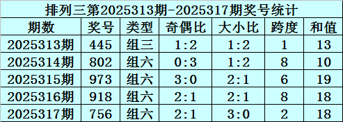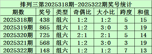 上期回顾:排列三第2025322期开奖号码为148。奖号类型为组六,奇偶比为1:2,大小比为1:2,跨度为7,和值为13。